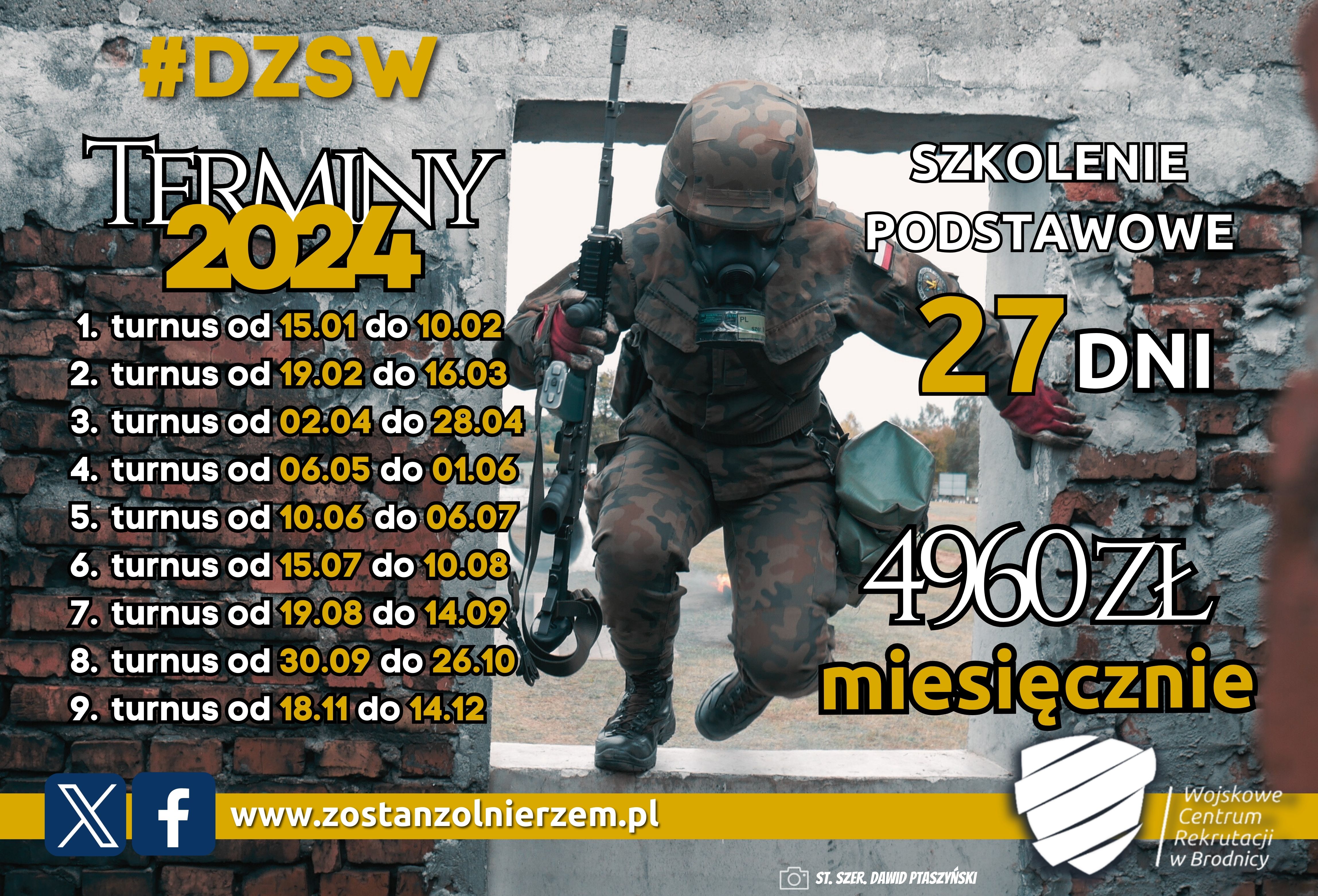 9 grudnia dobiegnie końca ostatni w bieżącym roku, VIII rekordowy turnus szkolenia podstawowego w ramach Dobrowolnej Zasadniczej Służby Wojskowej, który cieszył się rekordowym zainteresowaniem wśród ochotników zainteresowanych służbą wojskową. Ponad 8 200 ochotników przekroczyło bramy 84 jednostek wojskowych na terenie całego kraju (w tym ponad 740 ochotników z województwa kujawsko-pomorskiego). Od momentu wejścia w życie ustawy o Obronie Ojczyzny do Dobrowolnej Zasadniczej Służby Wojskowej wstąpiło ponad 42 000 ochotników (zarówno na szkolenie podstawowe, jak i szkolenie specjalistyczne bezpośrednio z pasywnej rezerwy). To pokazuje, jak Wojsko Polskie otworzyło się na oczekiwania społeczeństwa. Kolejny turnus DZSW rozpocznie się 15 stycznia 2024 roku. Ochotników zainteresowanych wstąpieniem w szeregi Wojska Polskiego zapraszamy do kujawsko-pomorskich Wojskowych Centrów Rekrutacji oraz zachęcamy do aplikowania do służby wojskowej za pośrednictwem portalu rekrutacyjnego zostanzolnierzem.pl.