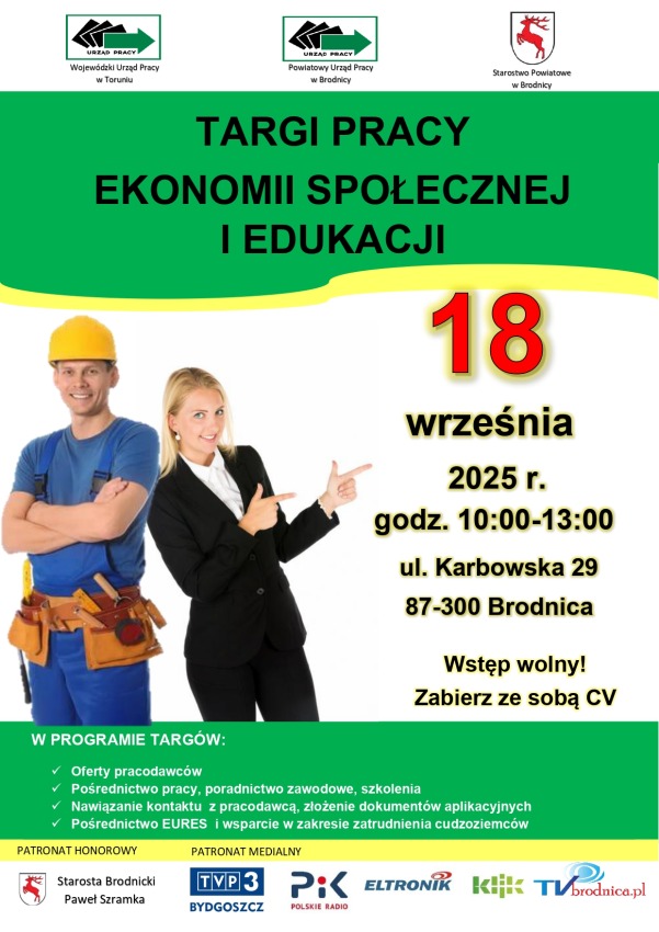 Powiatowy Urząd Pracy w Brodnicy uprzejmie informuje, że w dniu 18 września 2025r. w godz. 10:00 – 13.00, w hali sportowej Centrum Kształcenia Zawodowego i Ustawicznego w Brodnicy przy ul. Karbowskiej 29 we współpracy z Wojewódzkim Urzędem Pracy w Toruniu organizuje Targi Pracy, Ekonomii Społecznej i Edukacji.